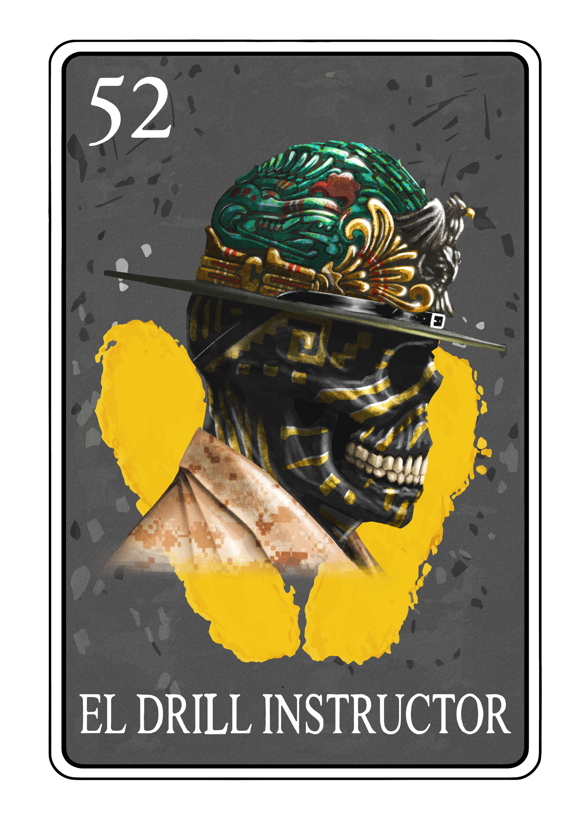 Honor the legacy of making Marines with the “El Drill Instructor” MEXUSMAR Lotería Card #52. This design pays tribute to 1952, the year the Drill Instructor School was formally established at Parris Island, a tradition now proudly carried on at MCRD San Diego.
