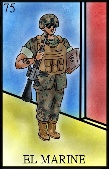 MEXUSMAR Loteria Card #75 honoring 1775 — the birth year of the Marine Corps. Our very first Loteria design blends Mexican culture with warrior tradition, making it a meaningful choice for Active Duty Marines, Veterans, and anyone proud to support our Servicemembers.
