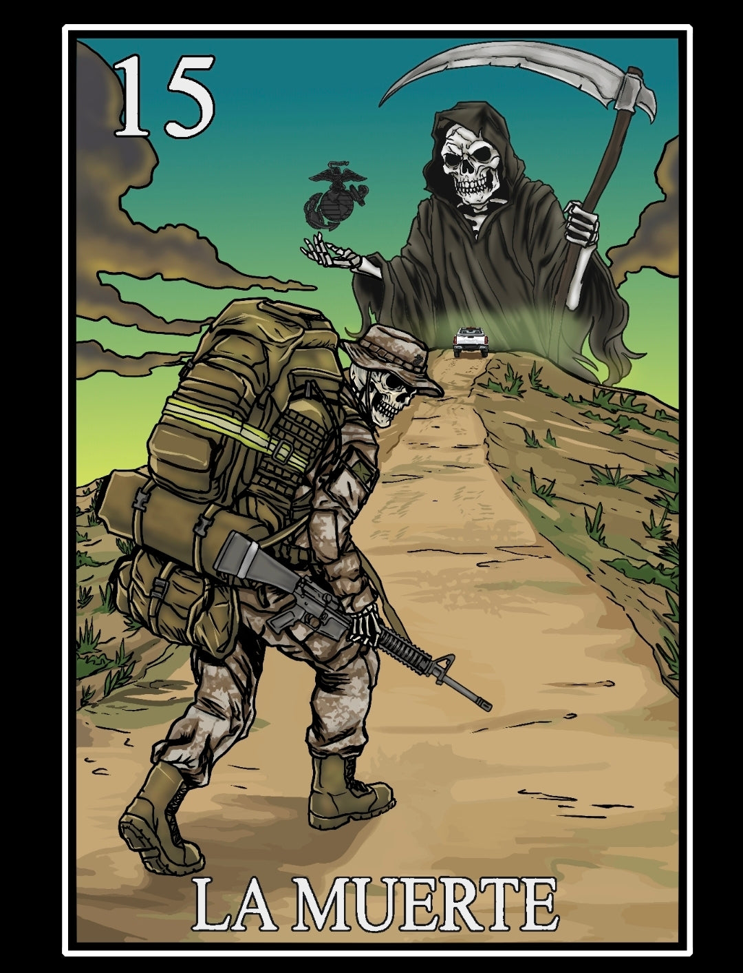 The MEXUSMAR Lotería Card No. 15, this design pays tribute to the legendary Reaper hike—and the final test of transformation: the 15-kilometer hike known as The Reaper, the culminating event of The Crucible.