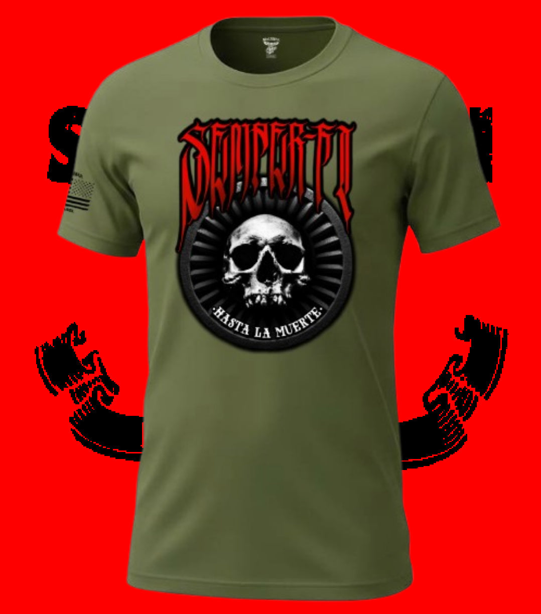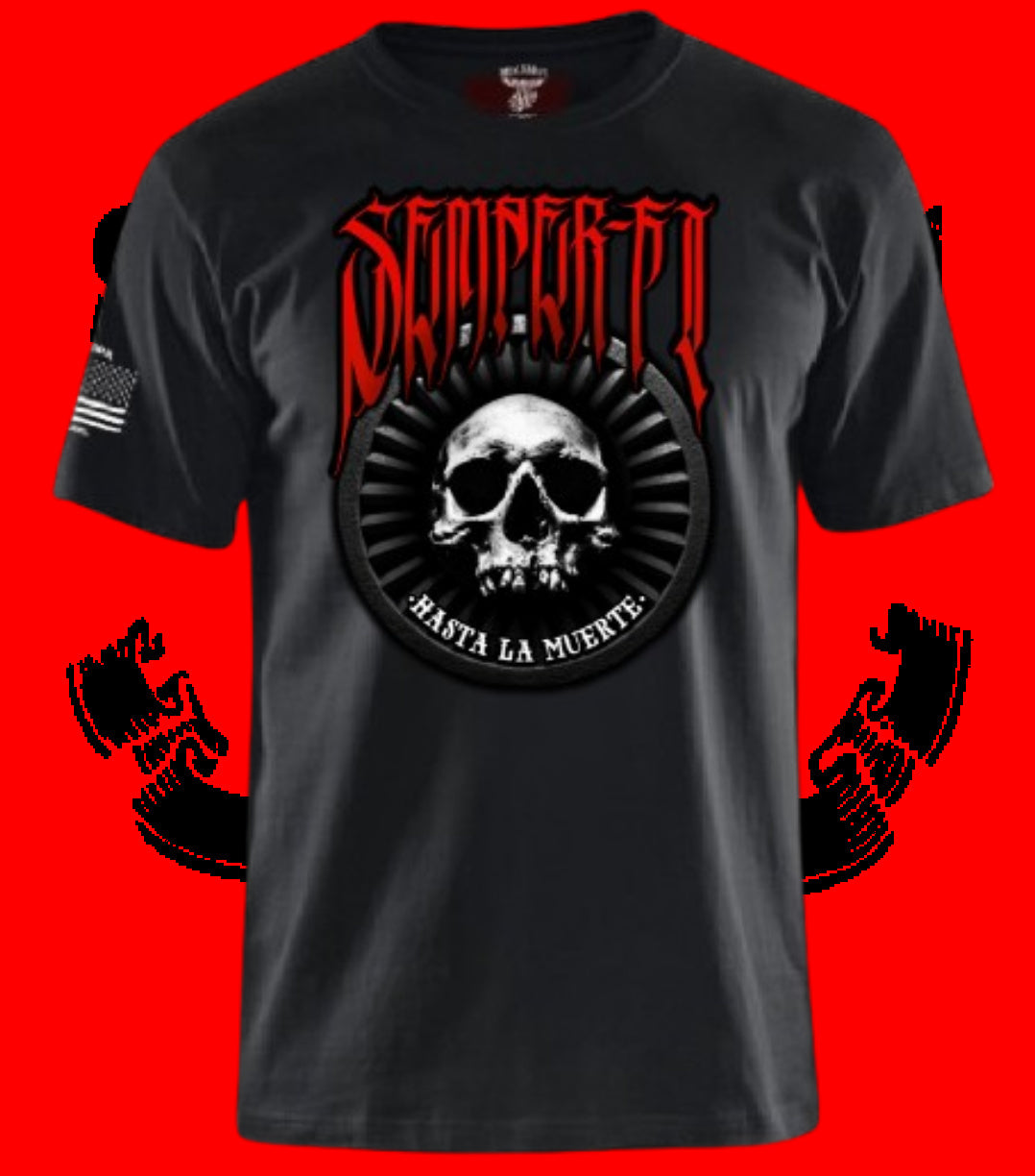 Introducing the Semper Fi Hasta La Muerte 2.0 T-shirt by La Linea MEXUSMAR, featuring a striking design inspired by the world famous relic of the Aztec god of the underworld, Mictlantecuhtli.